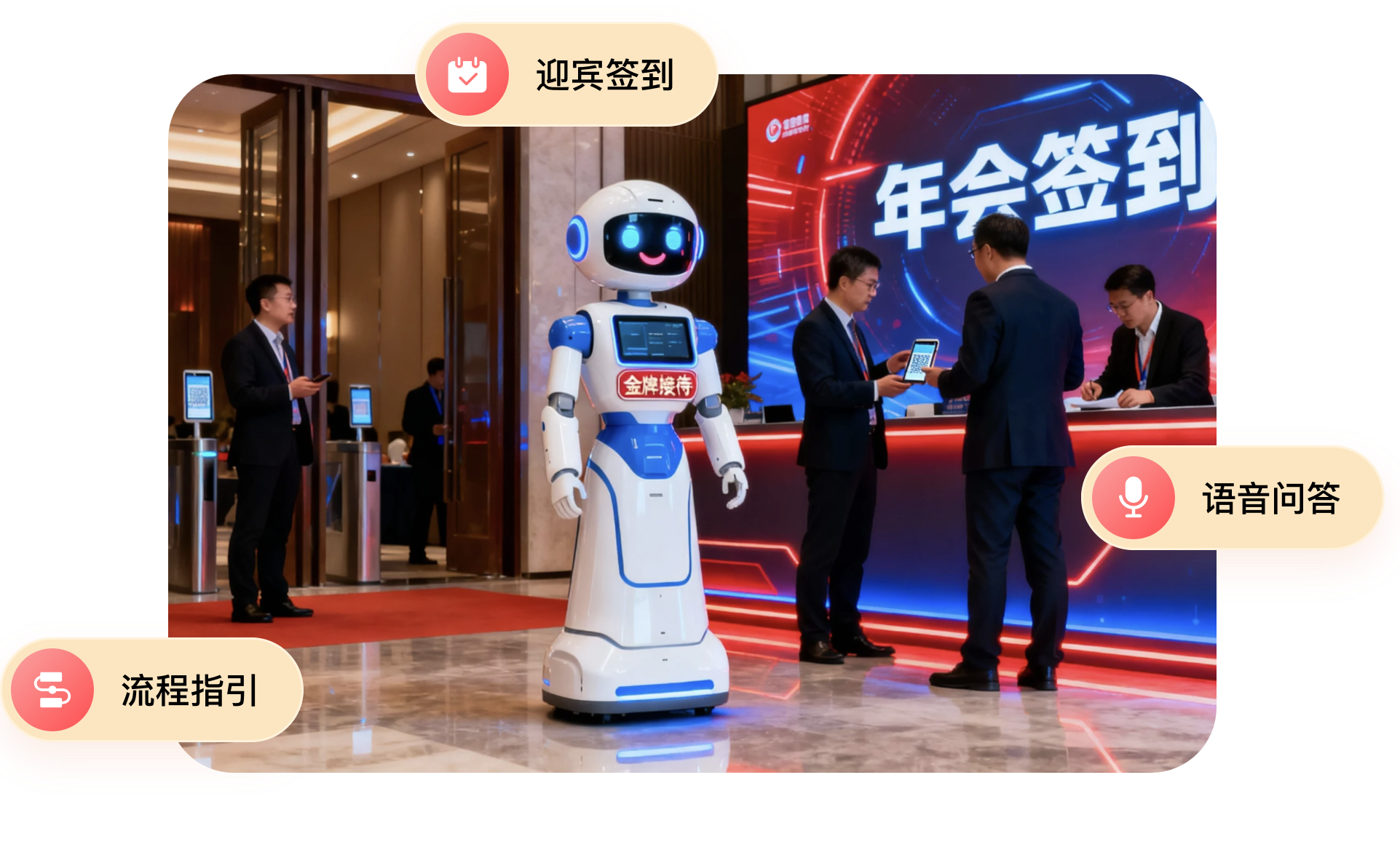 智能机器人化身 “金牌接待”,年会流程指引、语音问答,便捷签到,1 秒开启科技感入场体验。